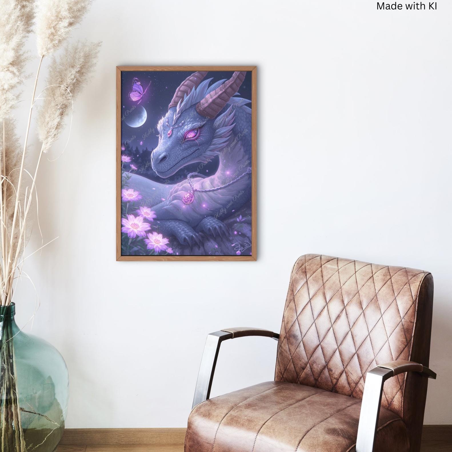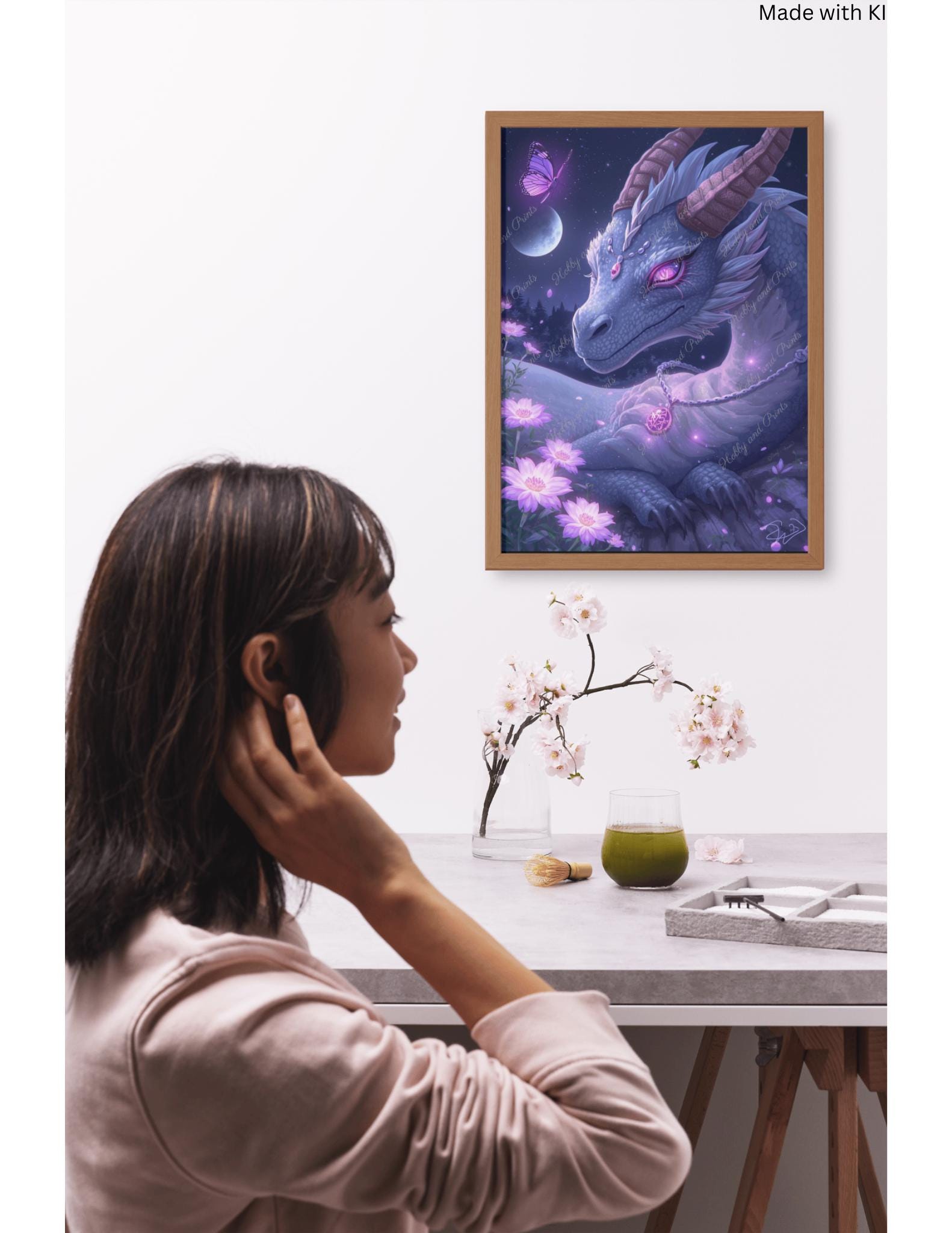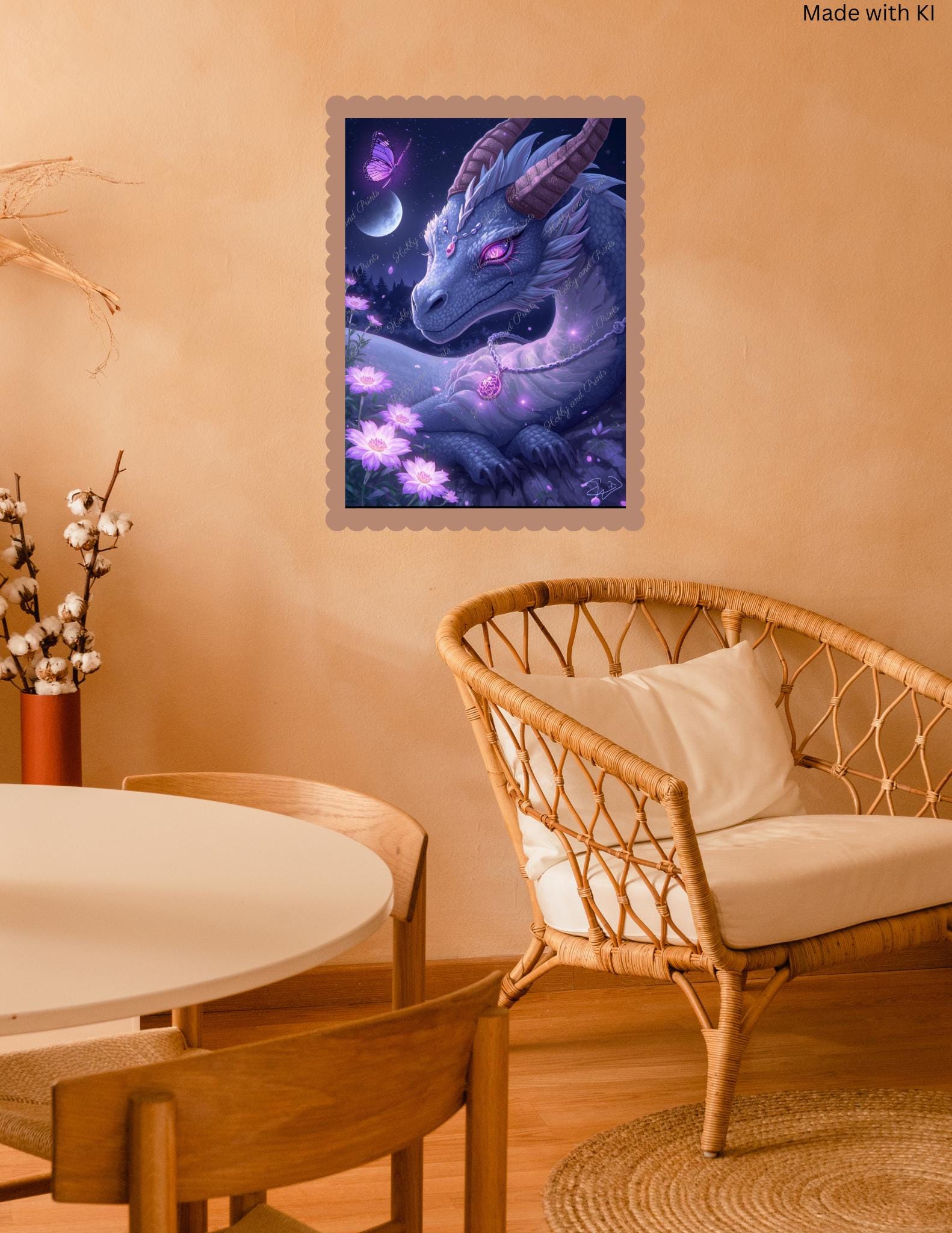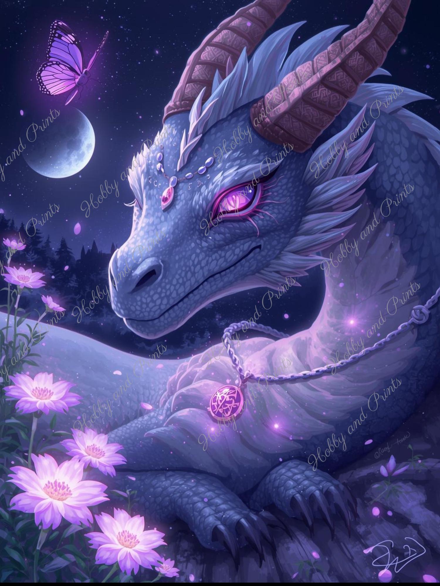 Immerse yourself in the enchanting world of fantasy with this unique 5D diamond painting! The motif depicts a graceful dragon with glowing purple eyes, resting peacefully among blooming flowers under the moonlight. A sparkling crystal pendant and a floating butterfly lend the image a magical aura.