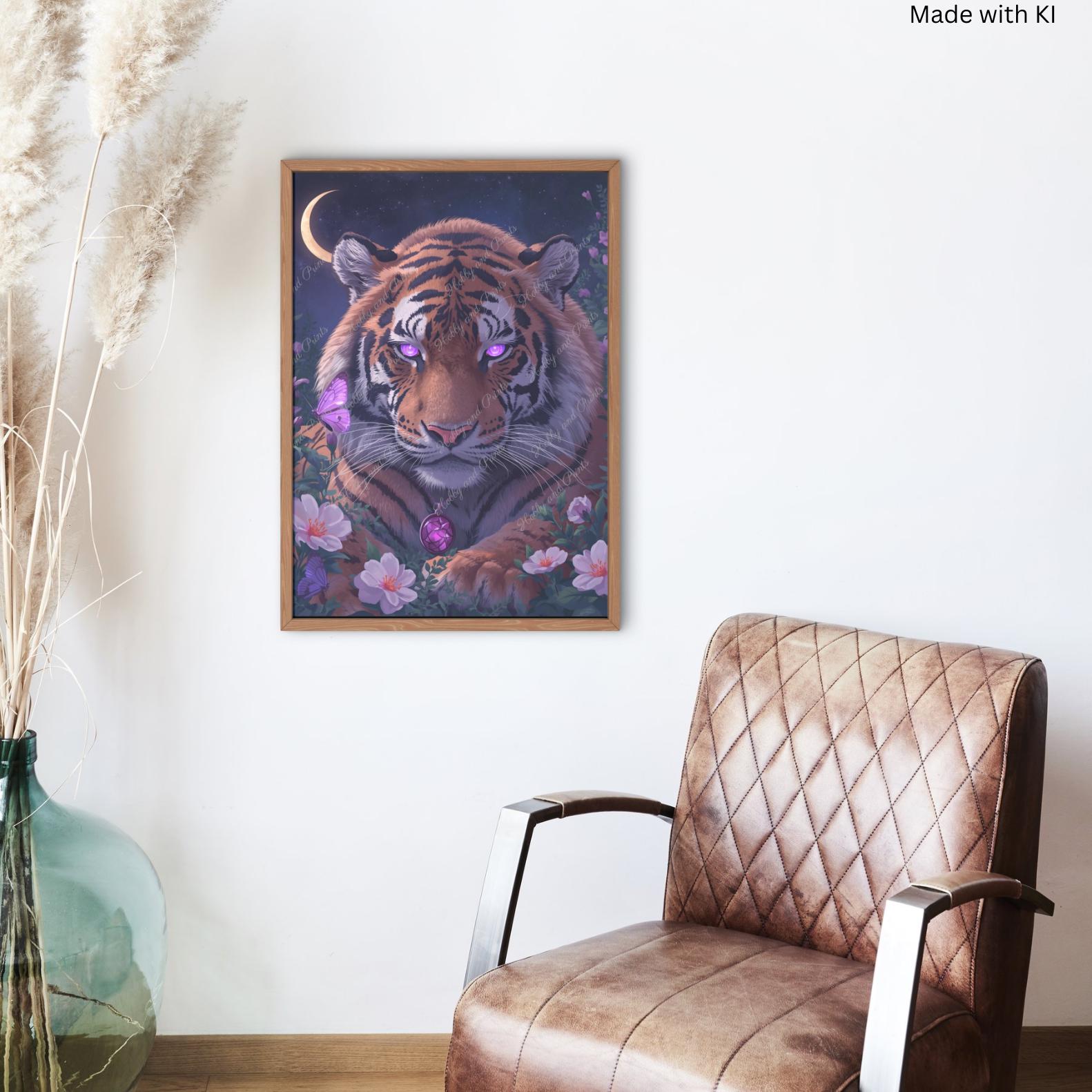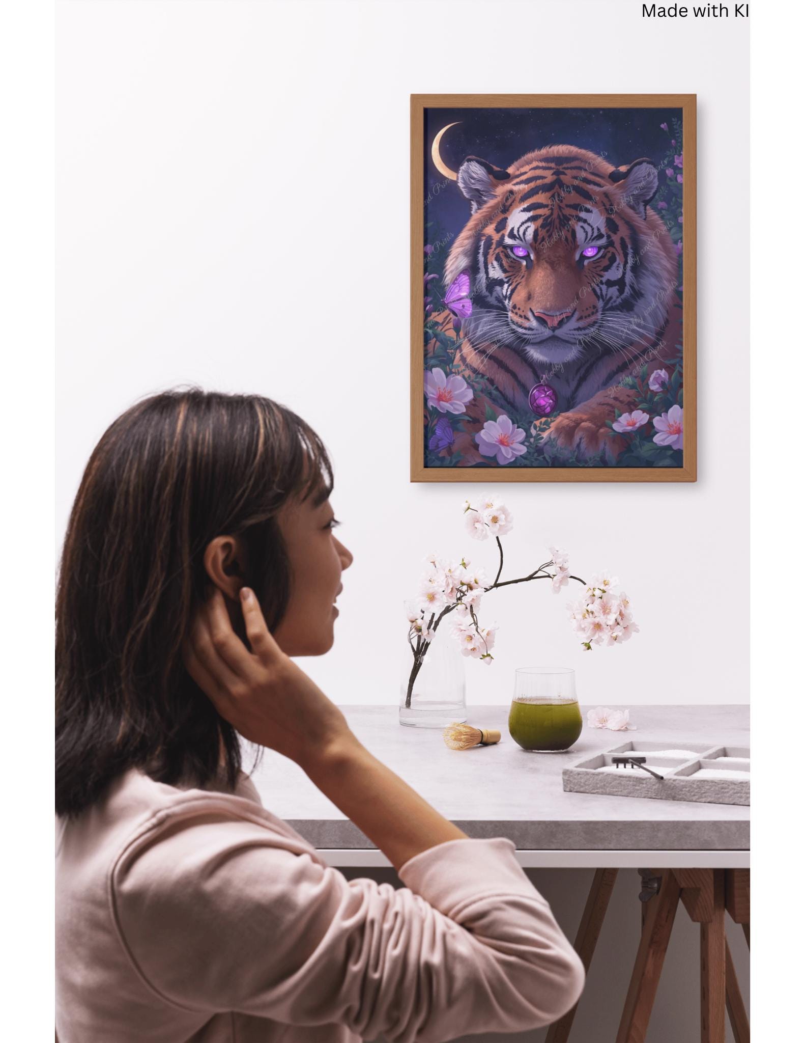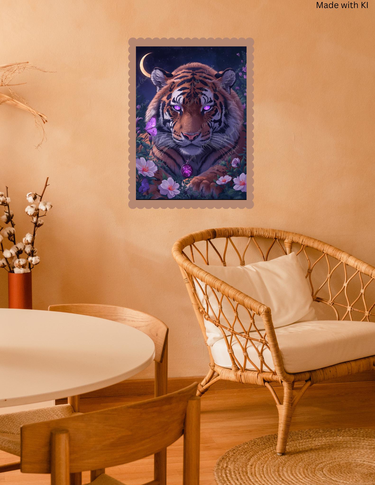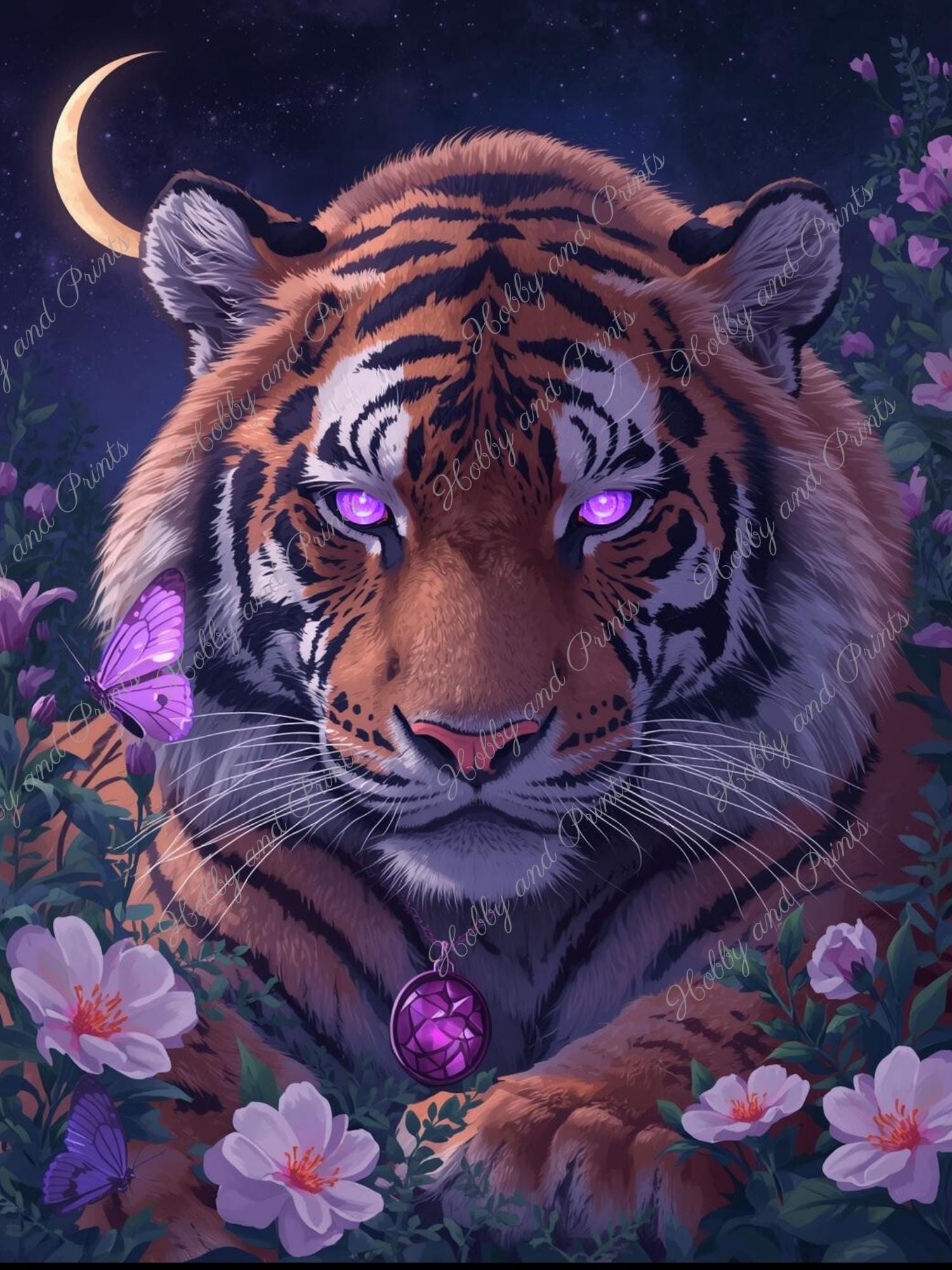 Immerse yourself in the enchanting world of fantasy with this unique 5D diamond painting! The motif depicts a graceful tiger with glowing purple eyes, resting peacefully among blooming flowers under the moonlight. A sparkling crystal pendant and a butterfly lend the image a magical aura.