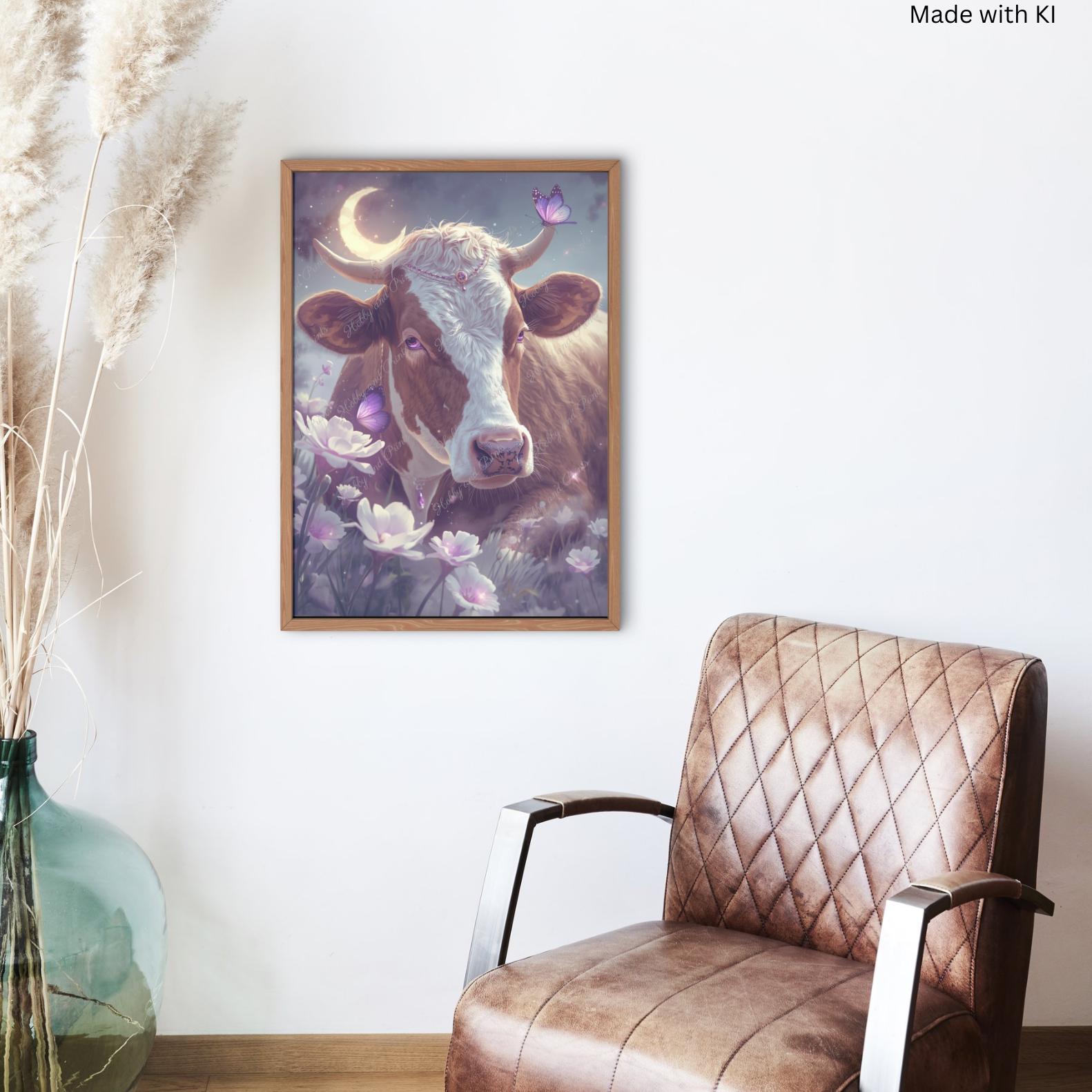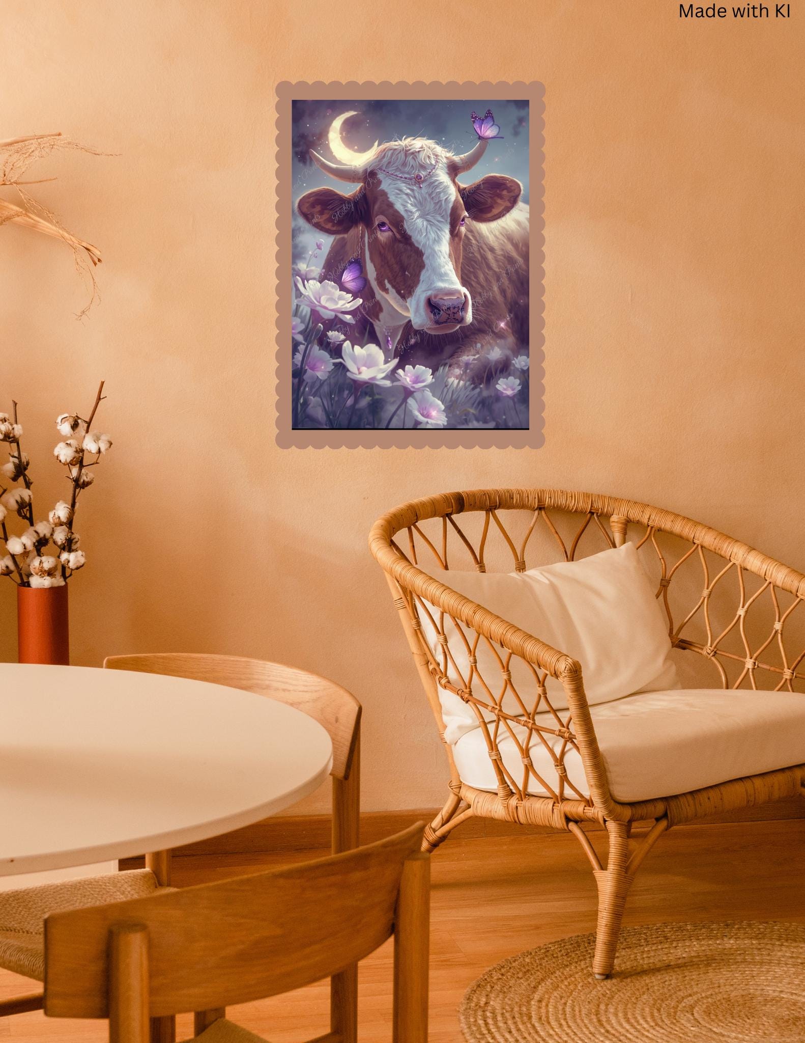 Immerse yourself in the enchanting world of fantasy with this unique 5D diamond painting! The motif depicts a graceful cow with glowing purple eyes, resting peacefully among blooming flowers under the moonlight. A sparkling crystal pendant and a butterfly lend the image a magical aura.