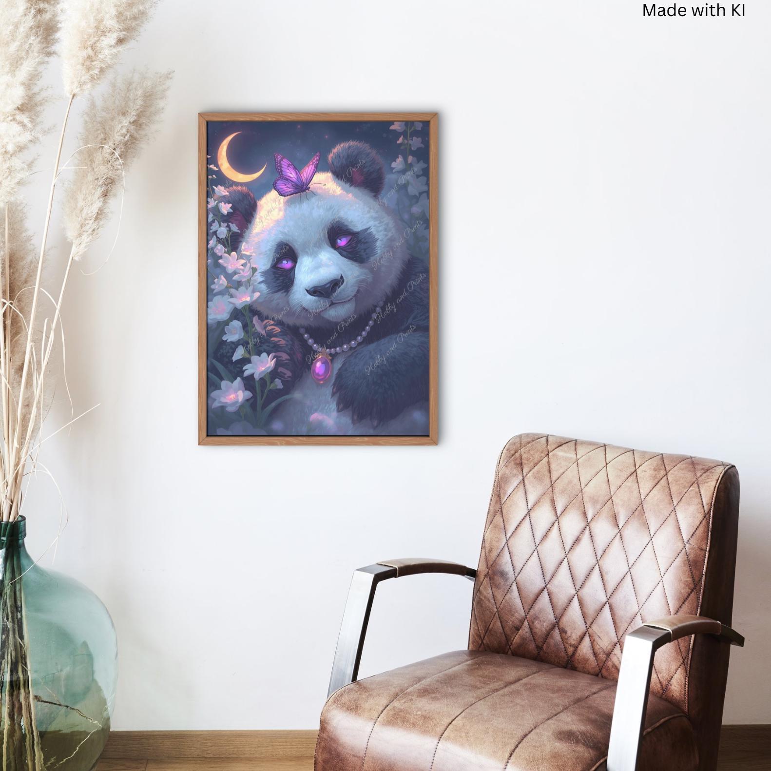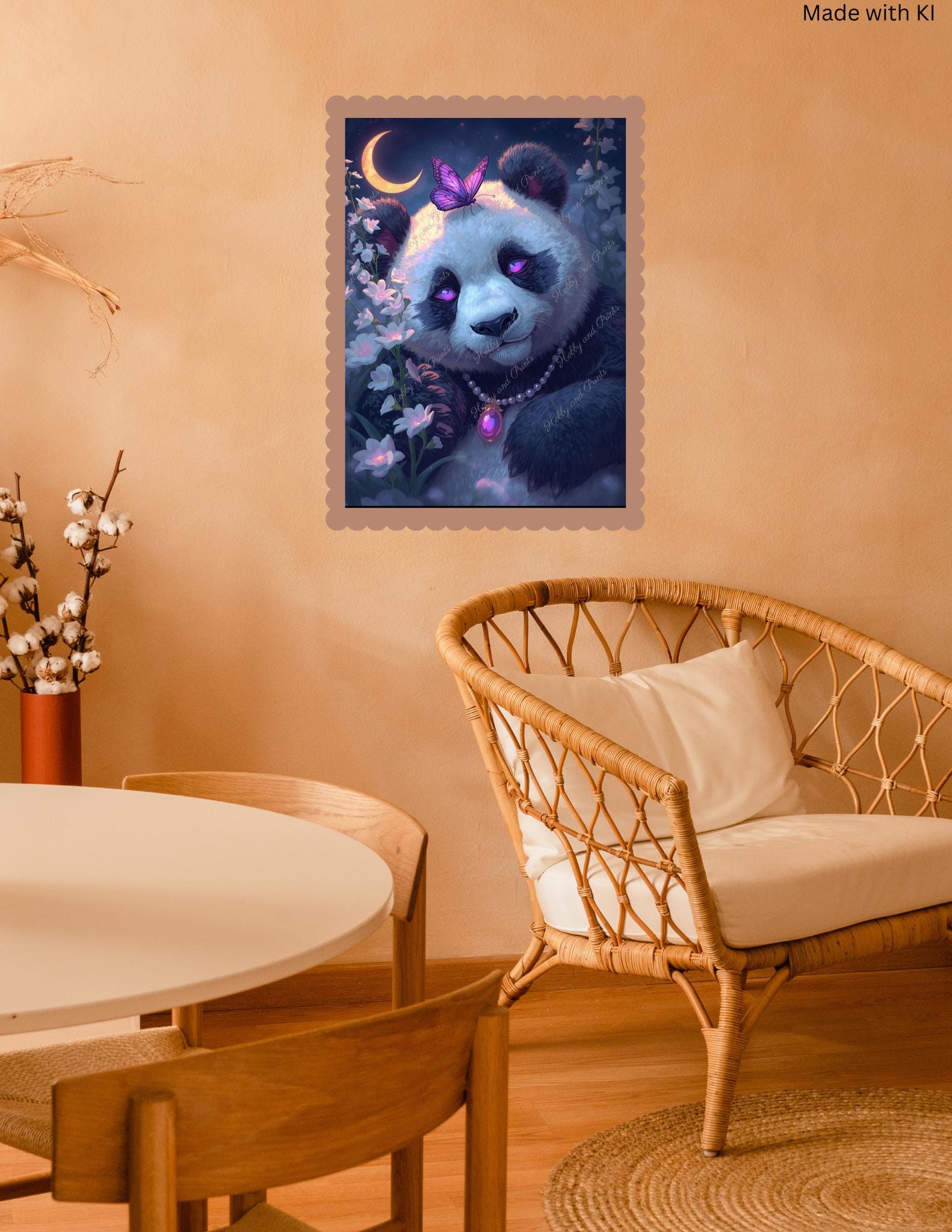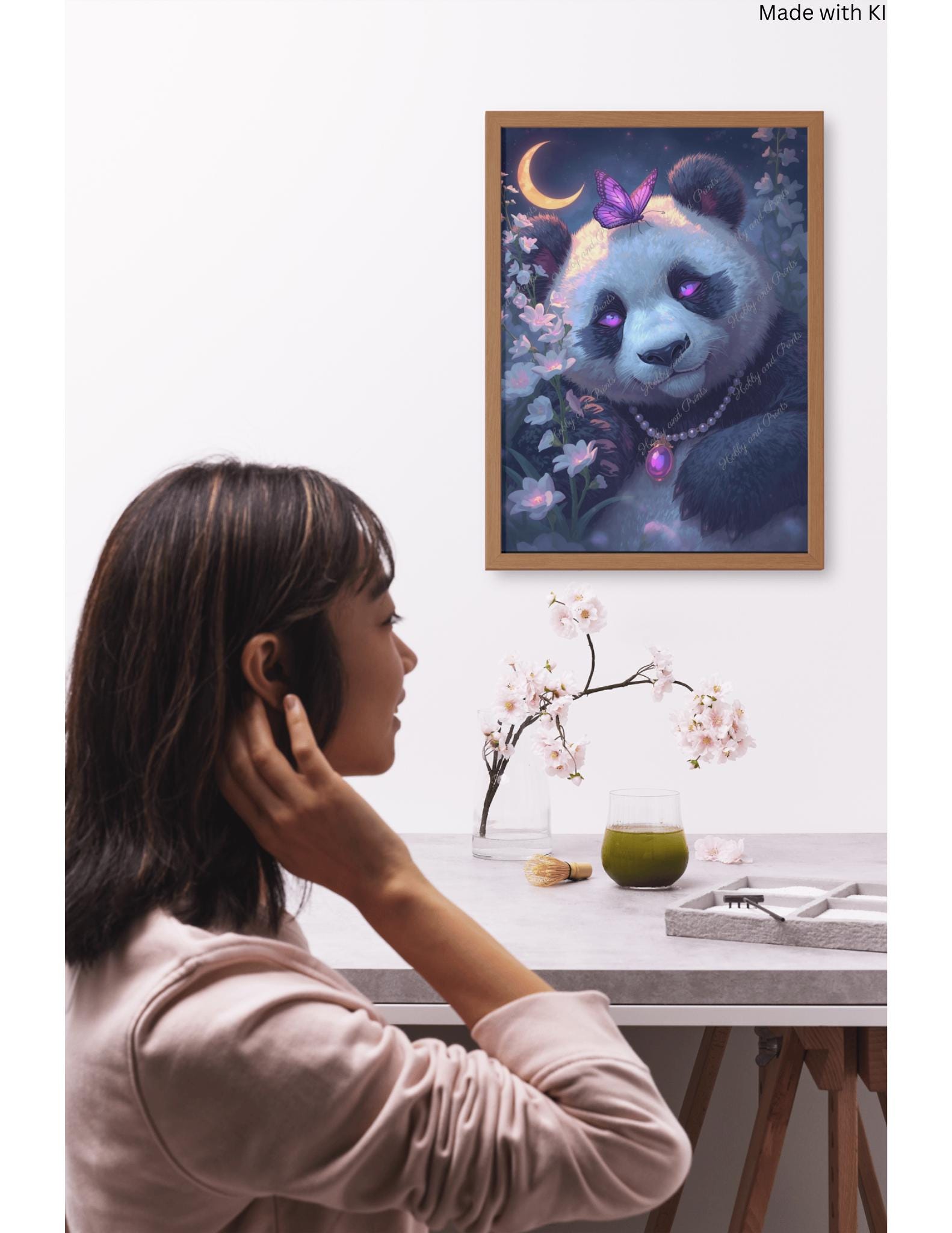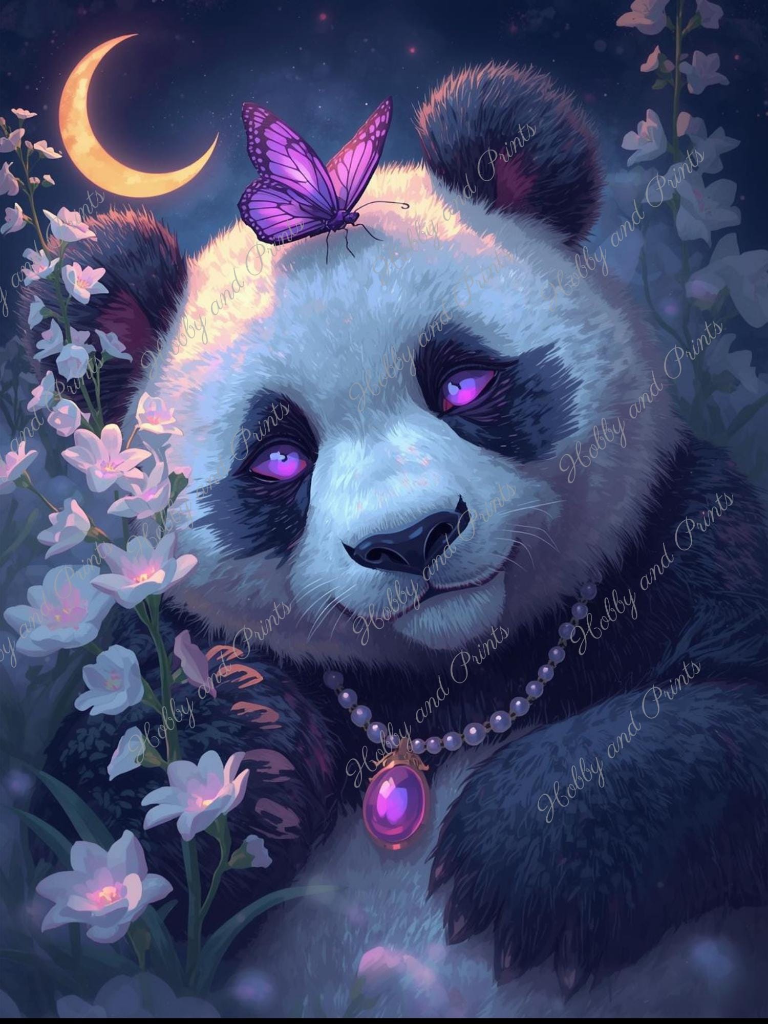 Immerse yourself in the enchanting world of fantasy with this unique 5D diamond painting! The motif depicts a graceful Panda bear with glowing purple eyes, resting peacefully among blooming flowers under the moonlight. A sparkling crystal pendant and a butterfly lend the image a magical aura.