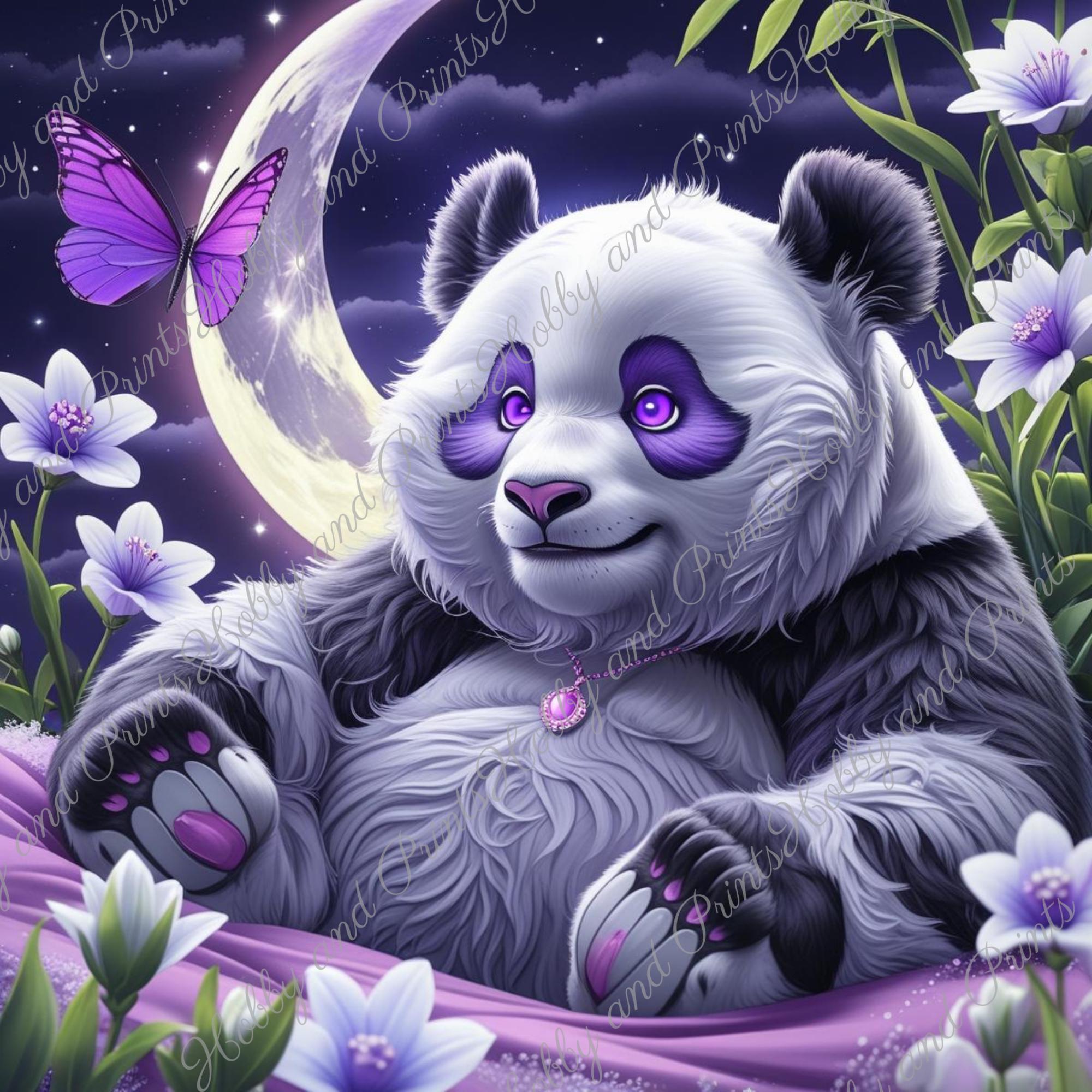 Be enchanted by the magic of the night with the "Panda bear Under the Moonlight" diamond painting. This high-quality DIY kit features an elegant panda bear with a majestic stance, vibrant purple eyes, and purple accents. The crescent moon in the background and delicate flowers underscore the mystical flair of the image.