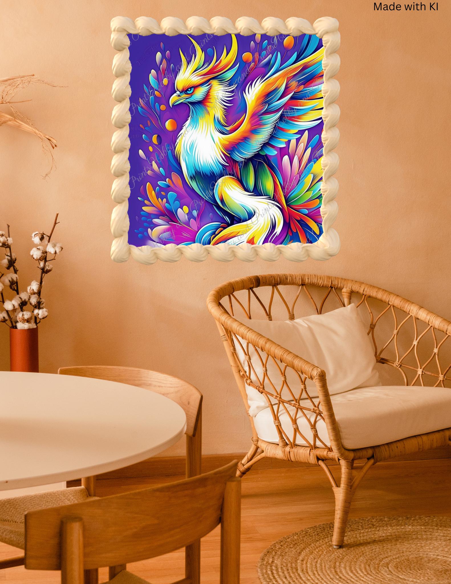 The motif features a stylized, cheerful phoenix in bright rainbow colors against a purple background. Surrounded by colorful, abstract elements and lovingly crafted details, this diamond painting will be a highlight in any room.