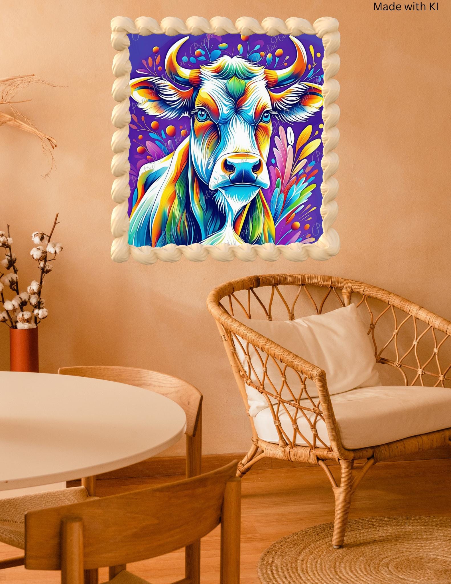 The motif features a stylized, cheerful cow in bright rainbow colors against a purple background. Surrounded by colorful, abstract elements and lovingly crafted details, this diamond painting will be a highlight in any room.