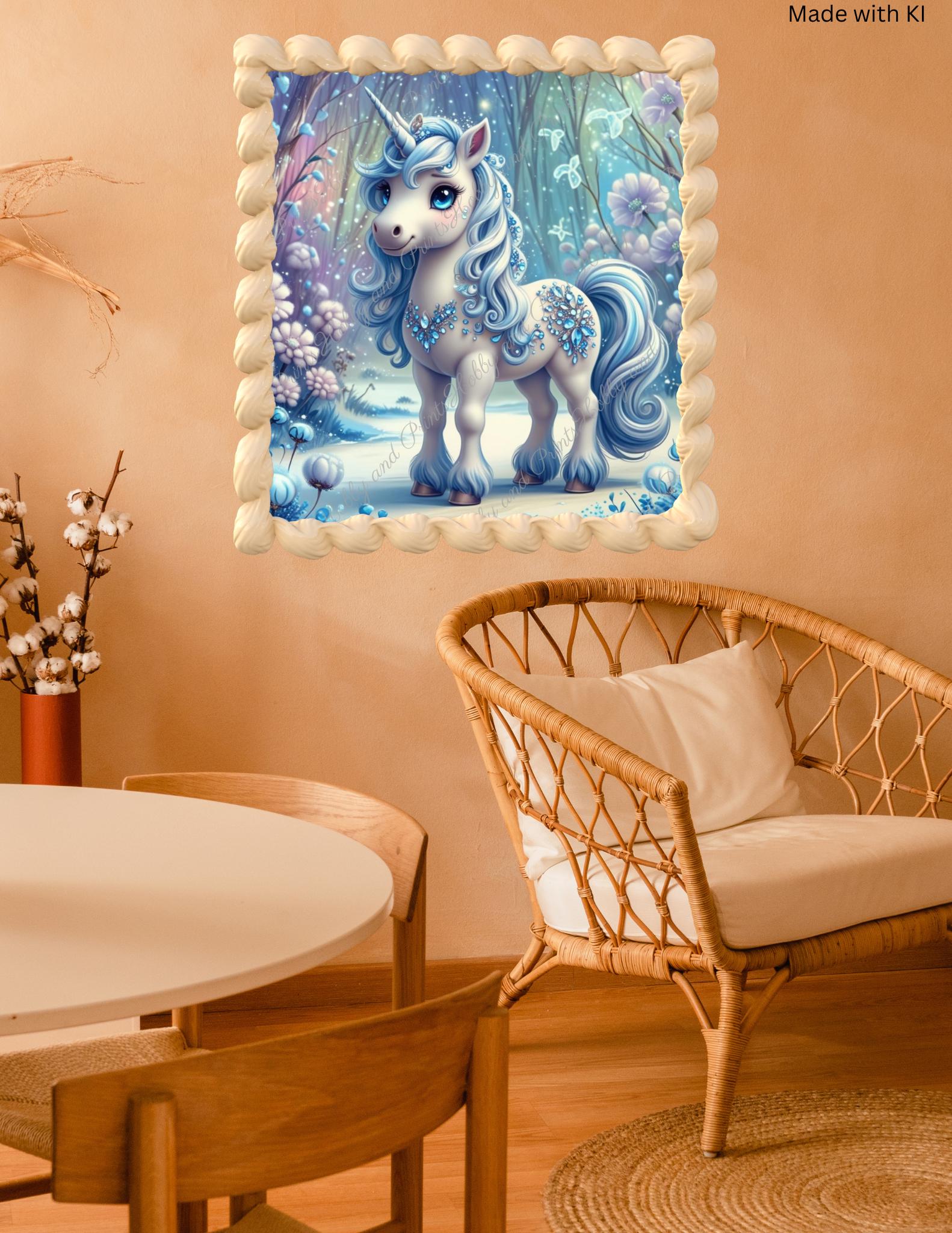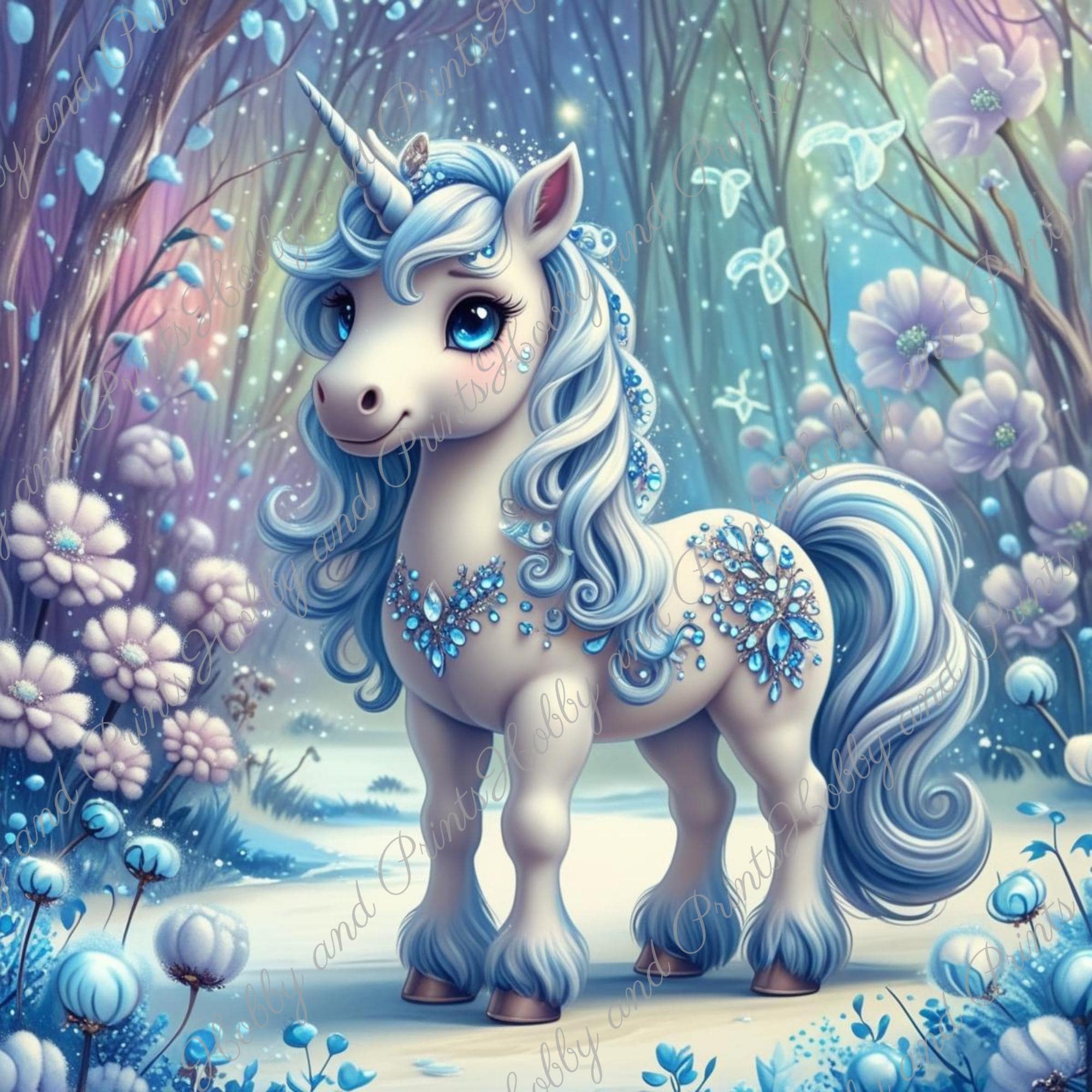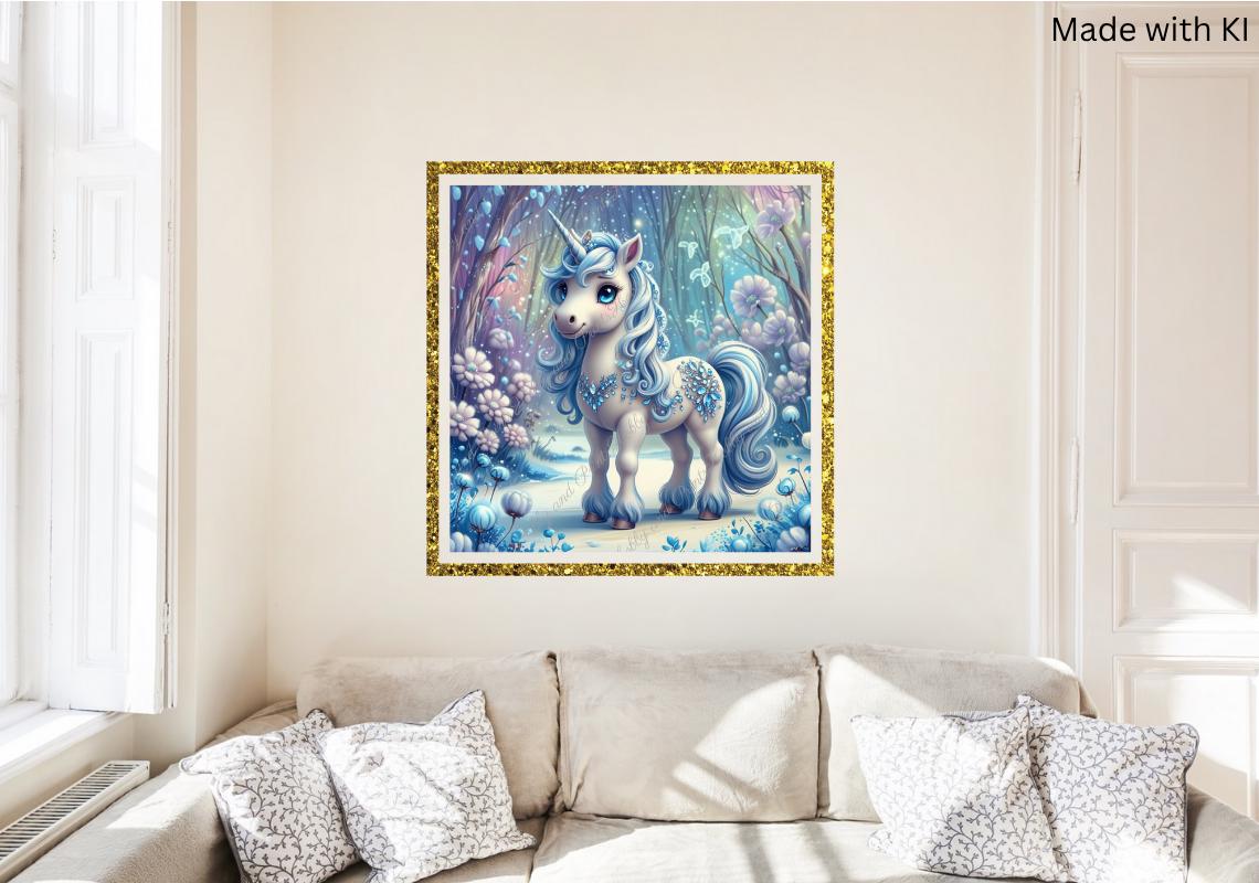 This enchanting diamond painting depicts a sweet, wintry unicorn with glittering jewelry patterns and crystal-blue details. Set amidst a shimmering snow-covered forest, the motif looks like something out of a fairy tale β ideal for fans of fantasy, unicorns, magic art, and children's room decor.
