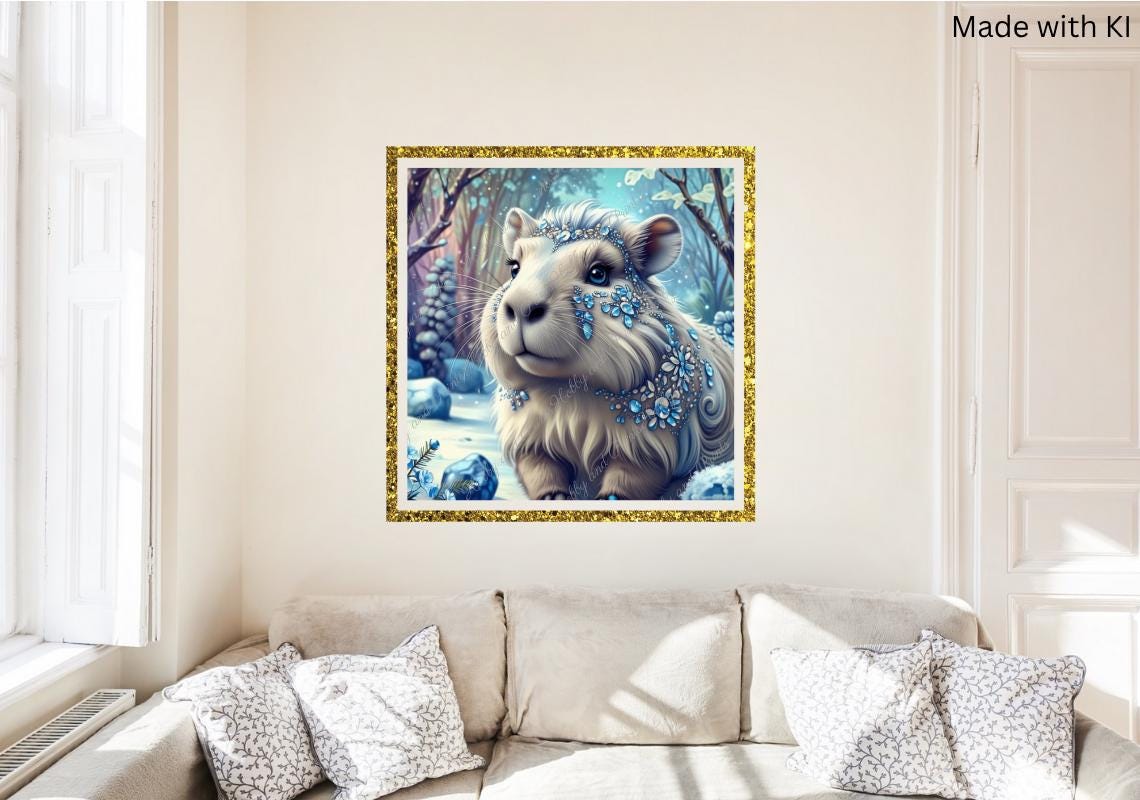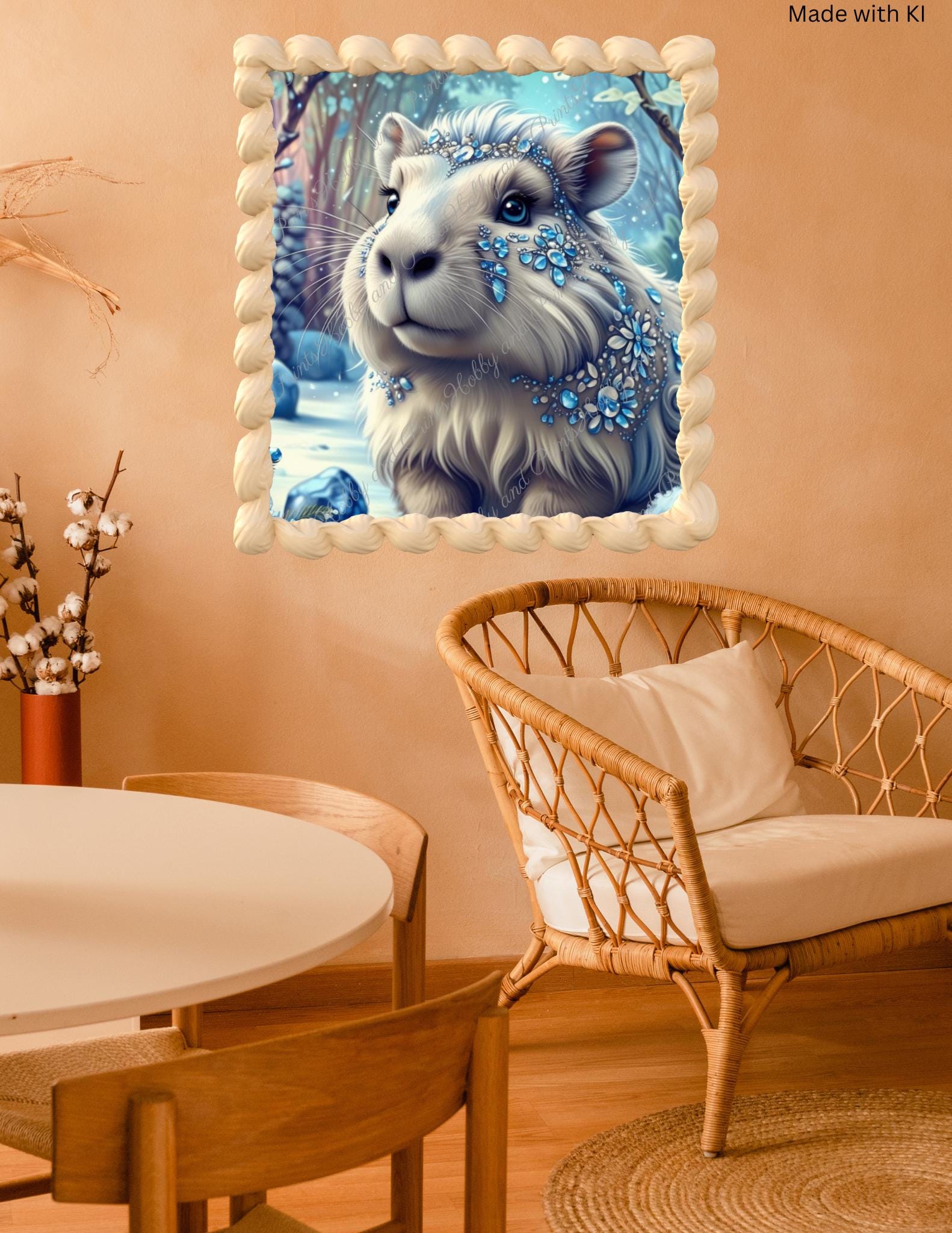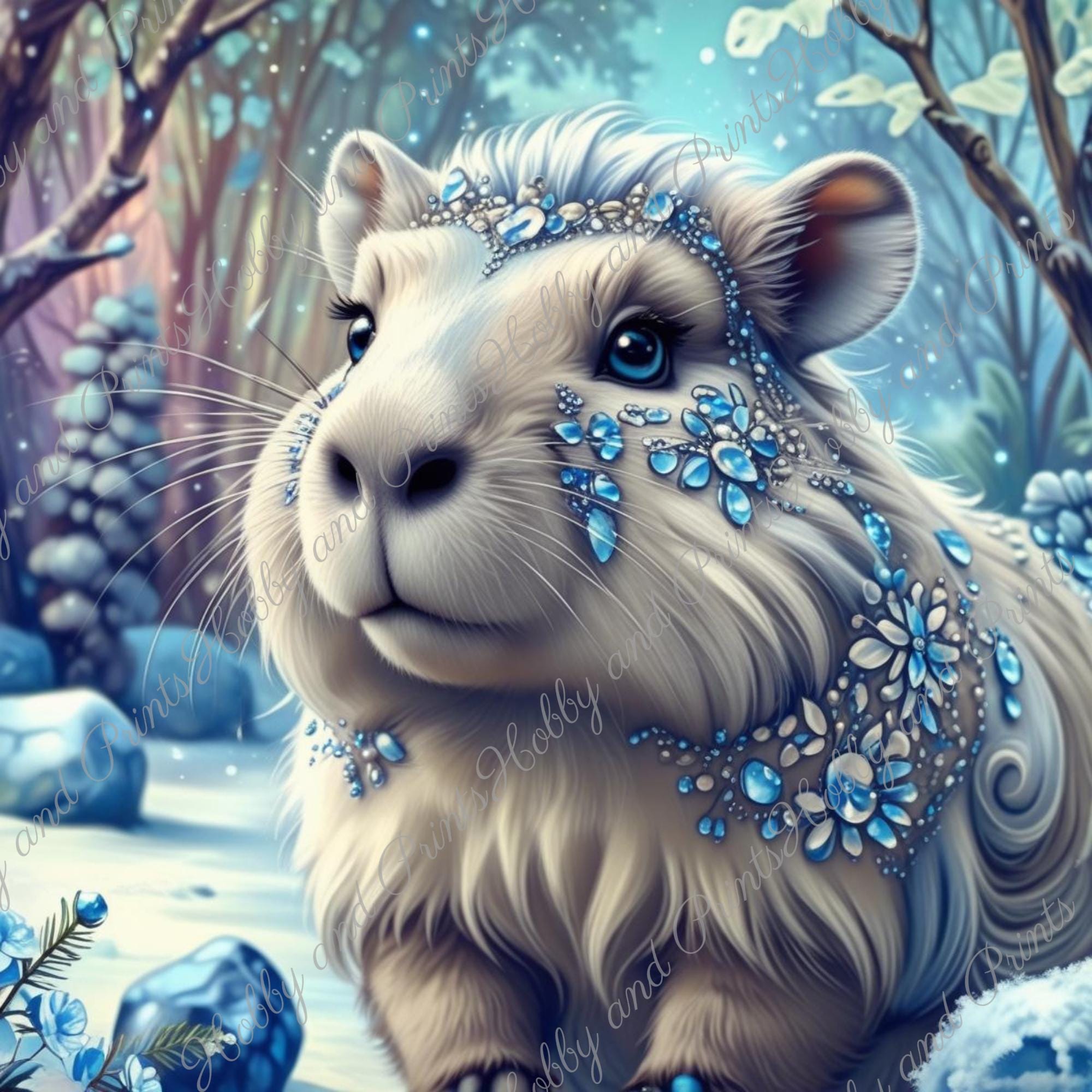 This enchanting diamond painting depicts a sweet, wintry Capybara with glittering jewelry patterns and crystal-blue details. Set amidst a shimmering snow-covered forest, the motif looks like something out of a fairy tale β ideal for fans of fantasy, Capybaras, magic art, and children's room decor.
