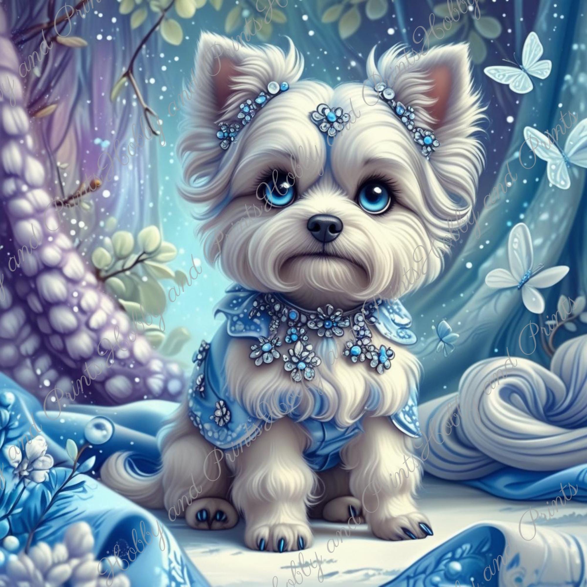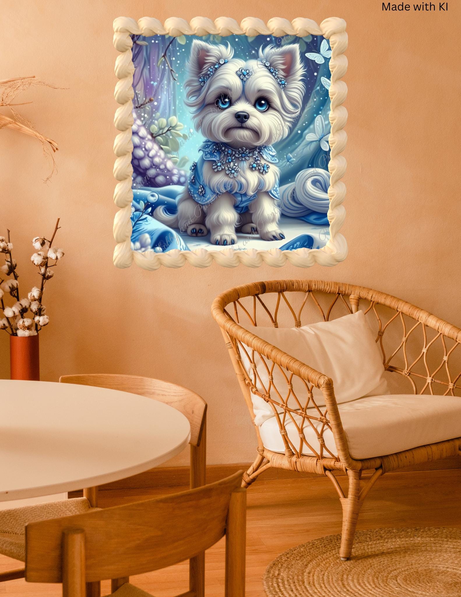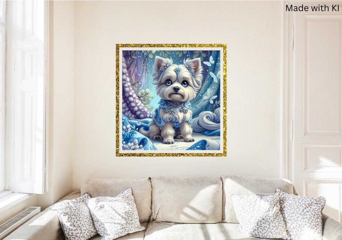 This enchanting diamond painting depicts a sweet, wintry dog with glittering jewelry patterns and crystal-blue details. Set amidst a shimmering snow-covered forest, the motif looks like something out of a fairy tale β ideal for fans of fantasy, dog , magic art, and children's room decor.