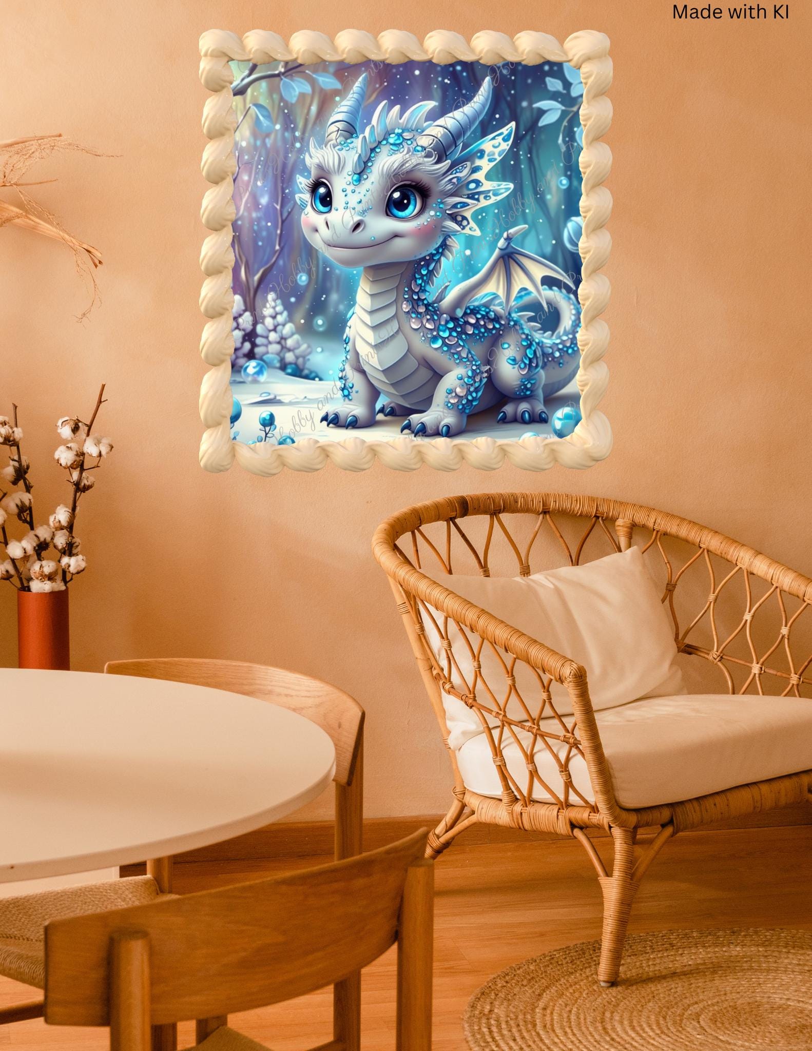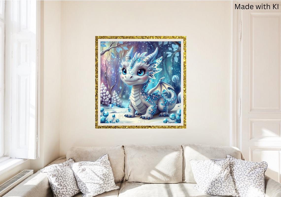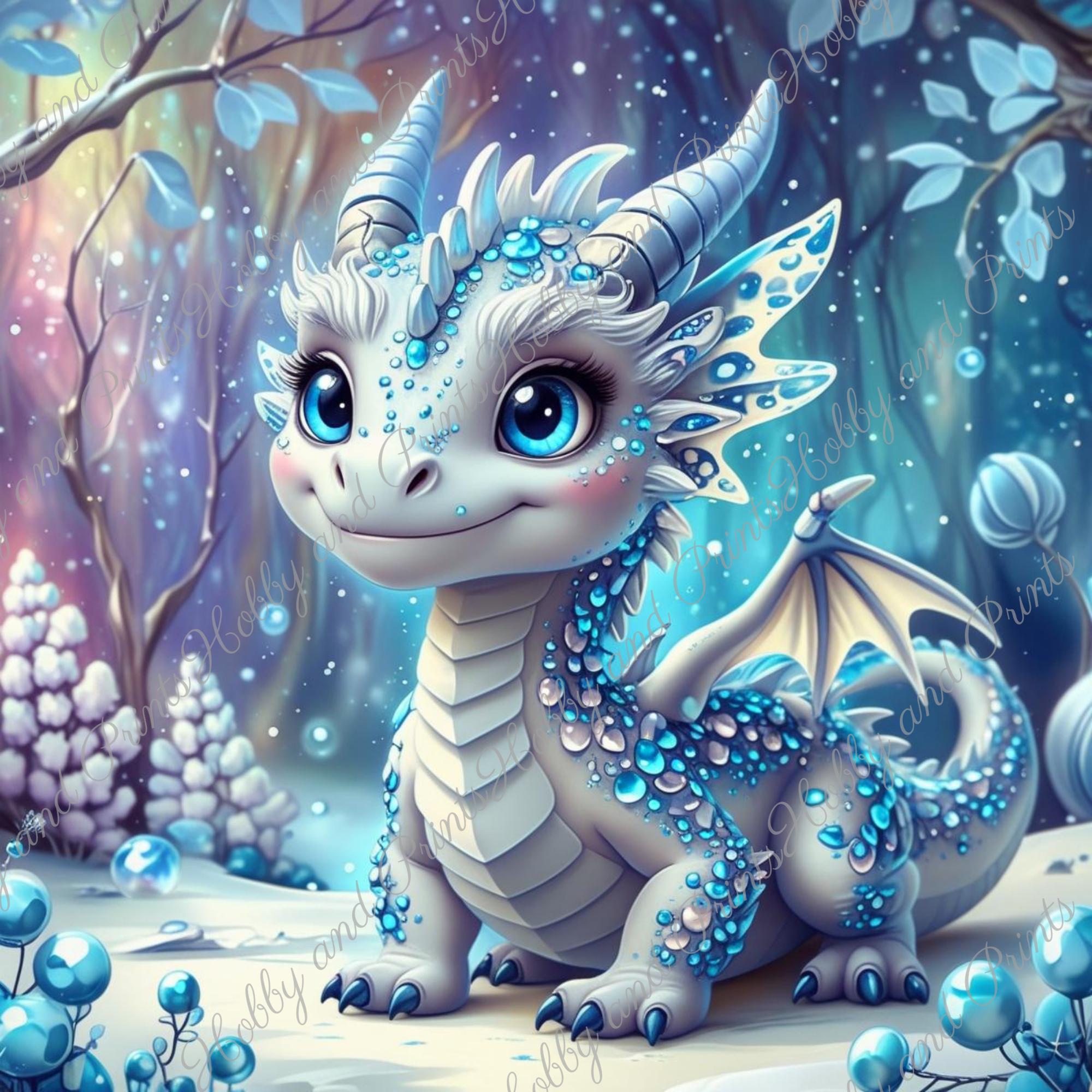 This enchanting diamond painting depicts a sweet, wintry dragon with glittering jewelry patterns and crystal-blue details. Set amidst a shimmering snow-covered forest, the motif looks like something out of a fairy tale β ideal for fans of fantasy, dragon , magic art, and children's room decor.
