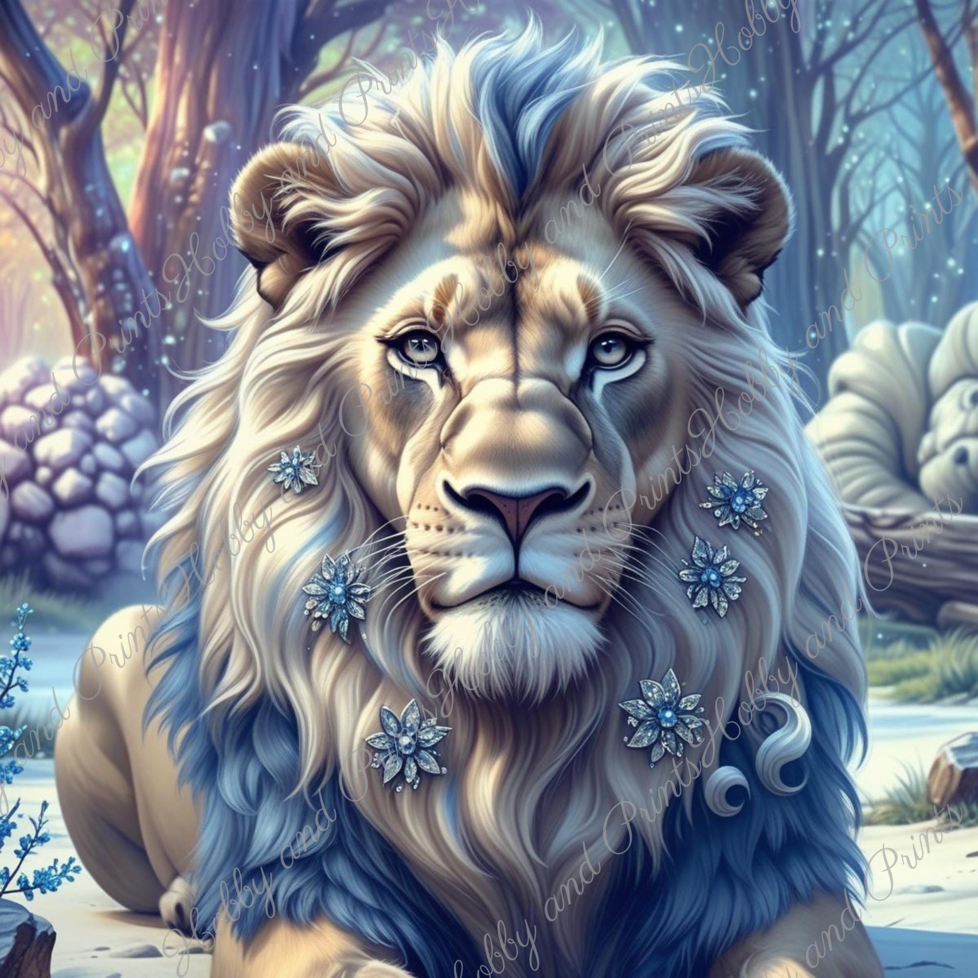 This enchanting diamond painting depicts a sweet, wintry lion with glittering jewelry patterns and crystal-blue details. Set amidst a shimmering snow-covered forest, the motif looks like something out of a fairy tale β ideal for fans of fantasy, lions , magic art, and children's room decor.