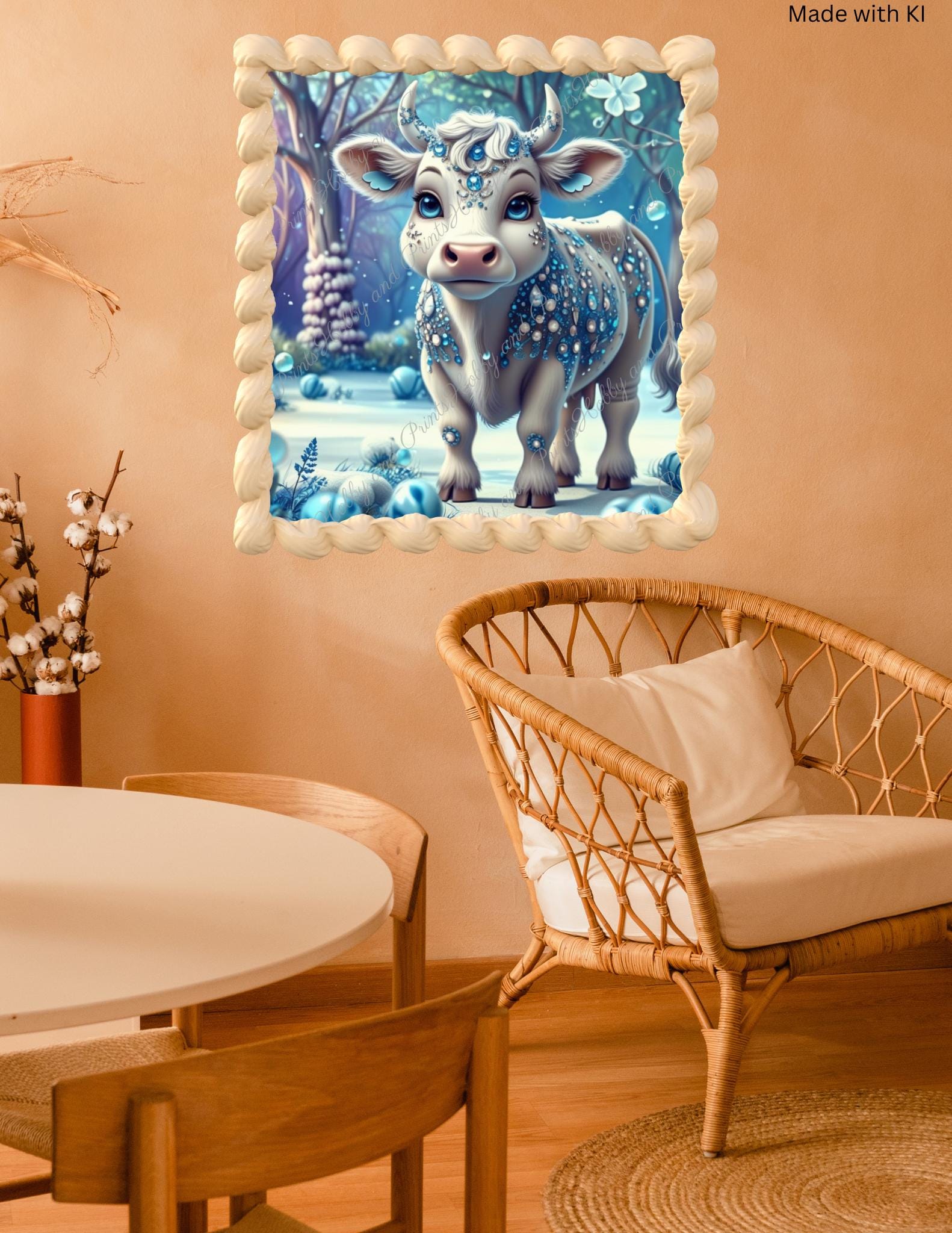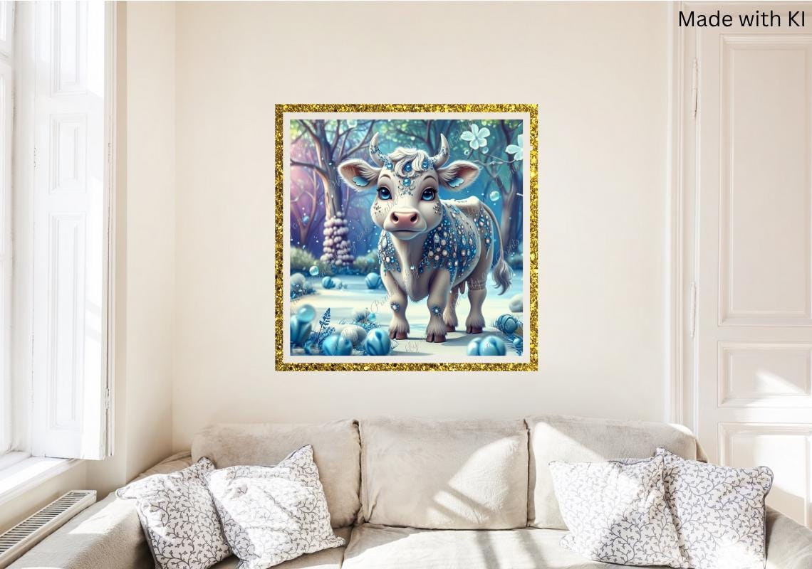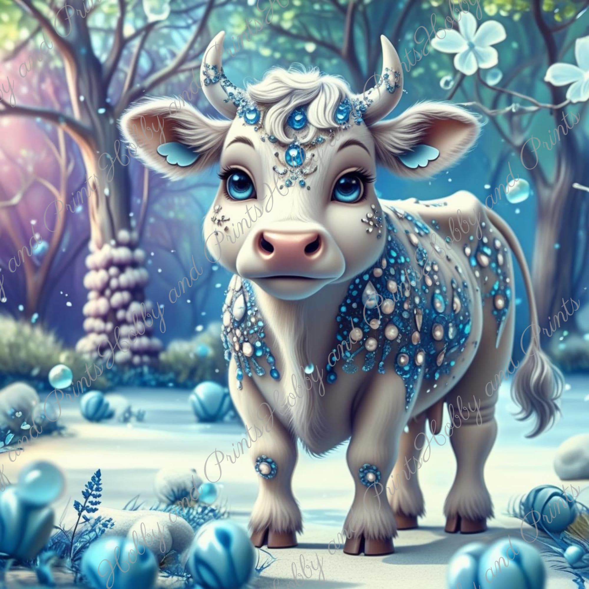 This enchanting diamond painting depicts a sweet, wintry cow with glittering jewelry patterns and crystal-blue details. Set amidst a shimmering snow-covered forest, the motif looks like something out of a fairy tale β ideal for fans of fantasy, cows , magic art, and children's room decor.