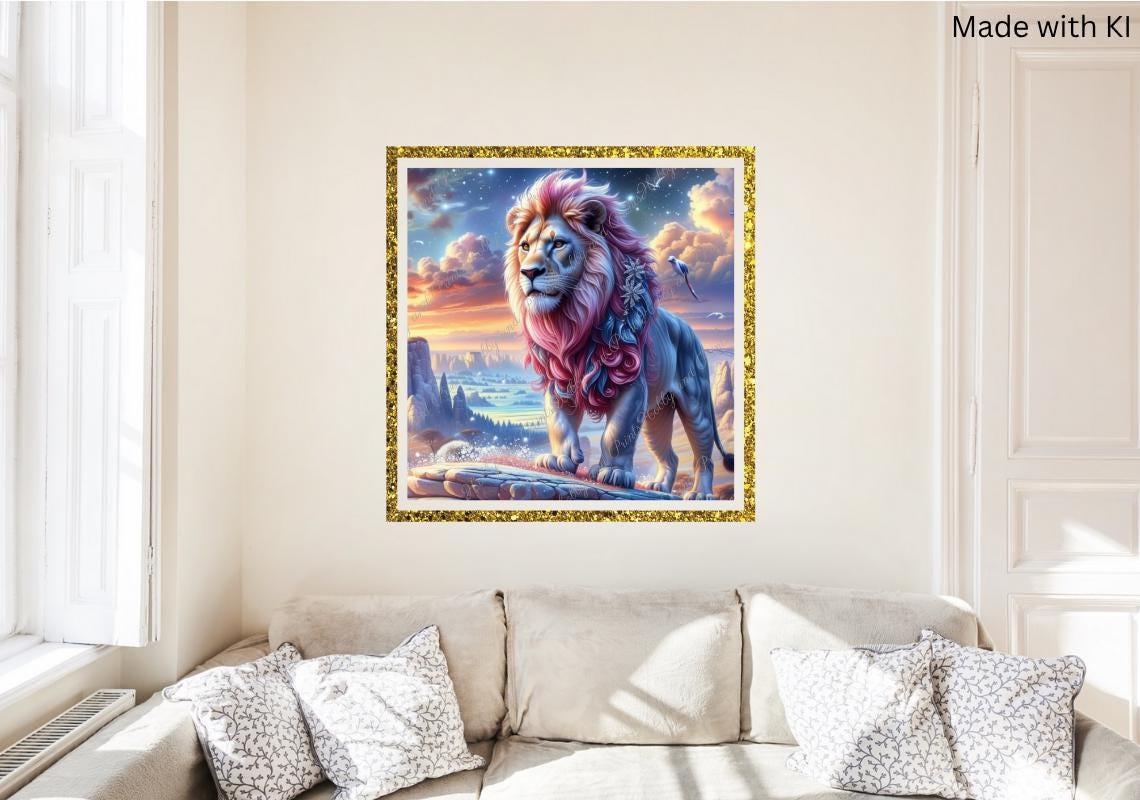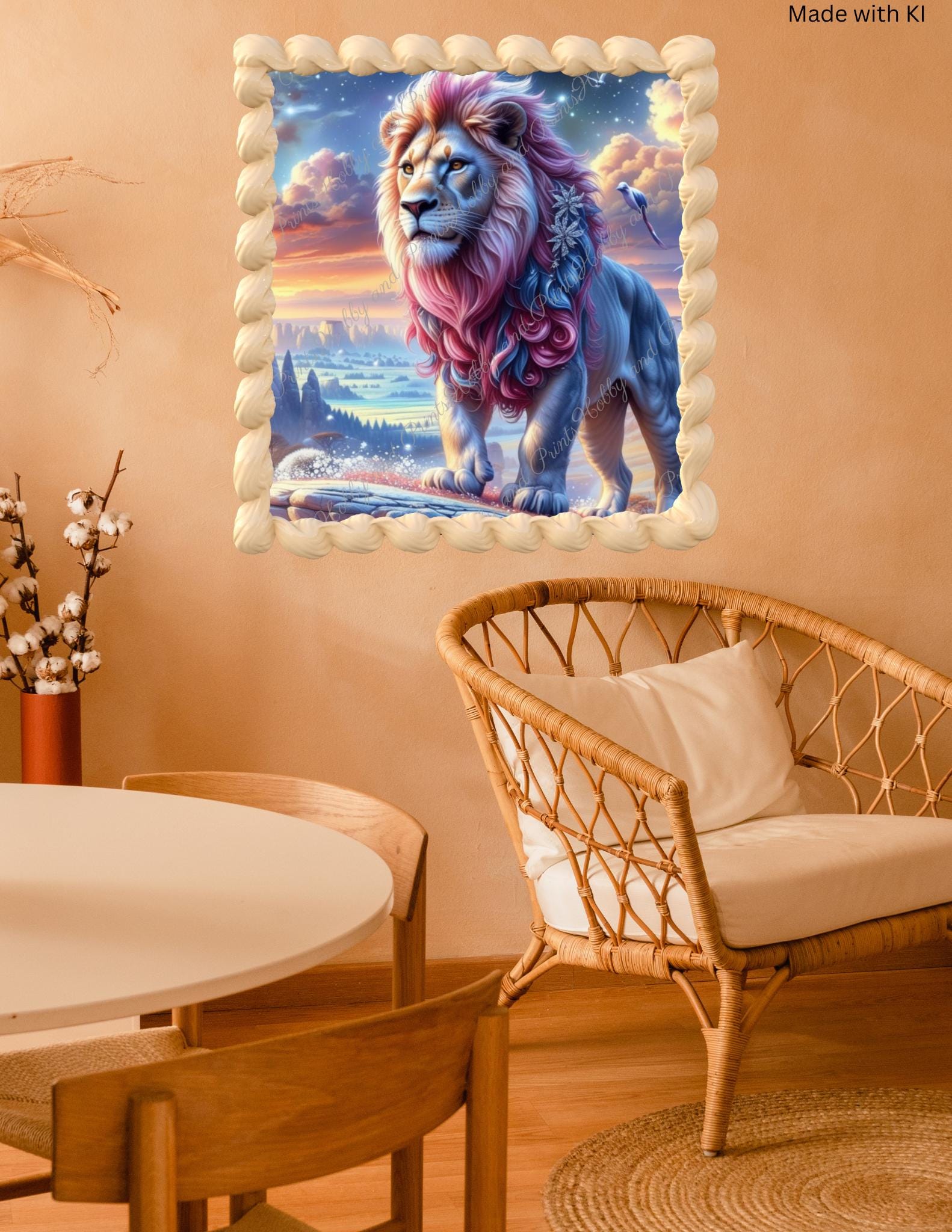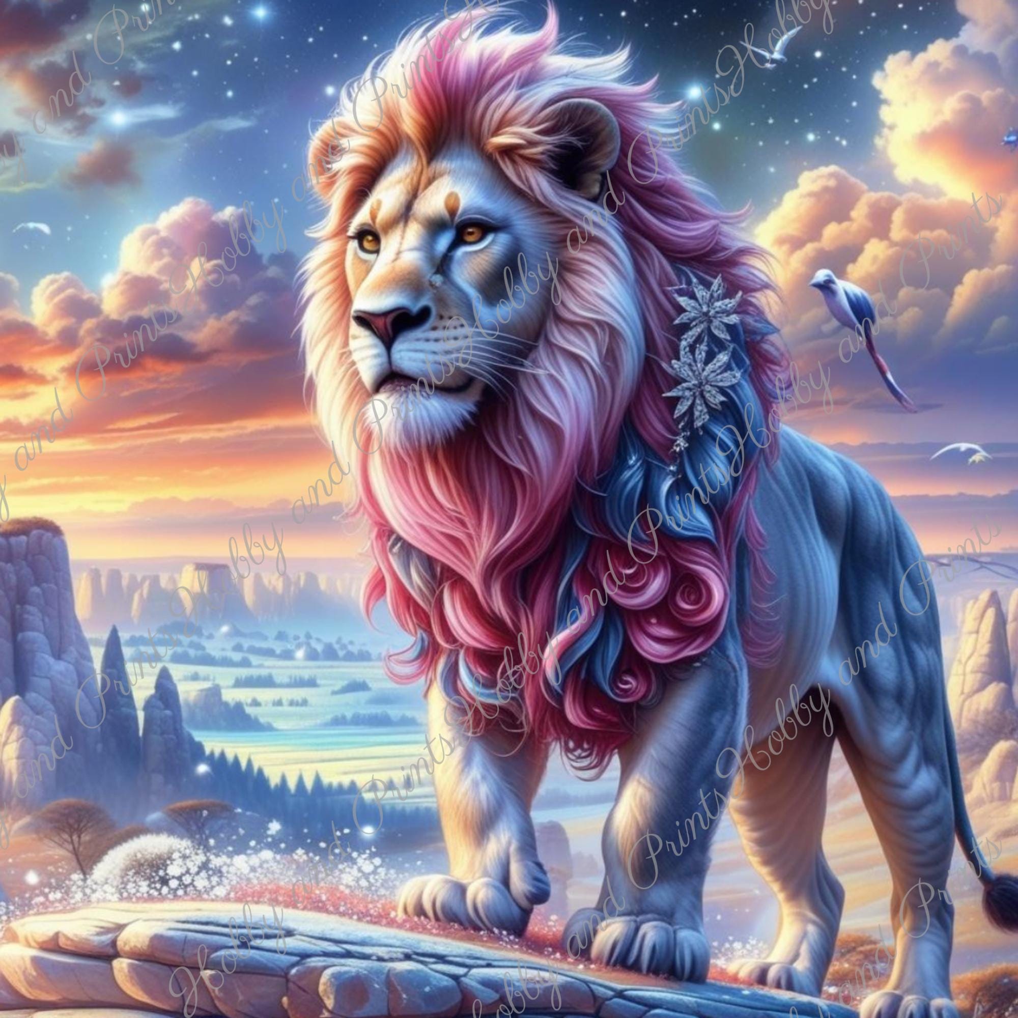 Immerse yourself in a world of sparkling creativity with this high-quality diamond painting, "Majestic Fantasy Lion." The impressive design depicts a proud lion against a dreamlike landscape – its vibrant mane in shades of pink, blue, and purple makes this picture a true eye-catcher.